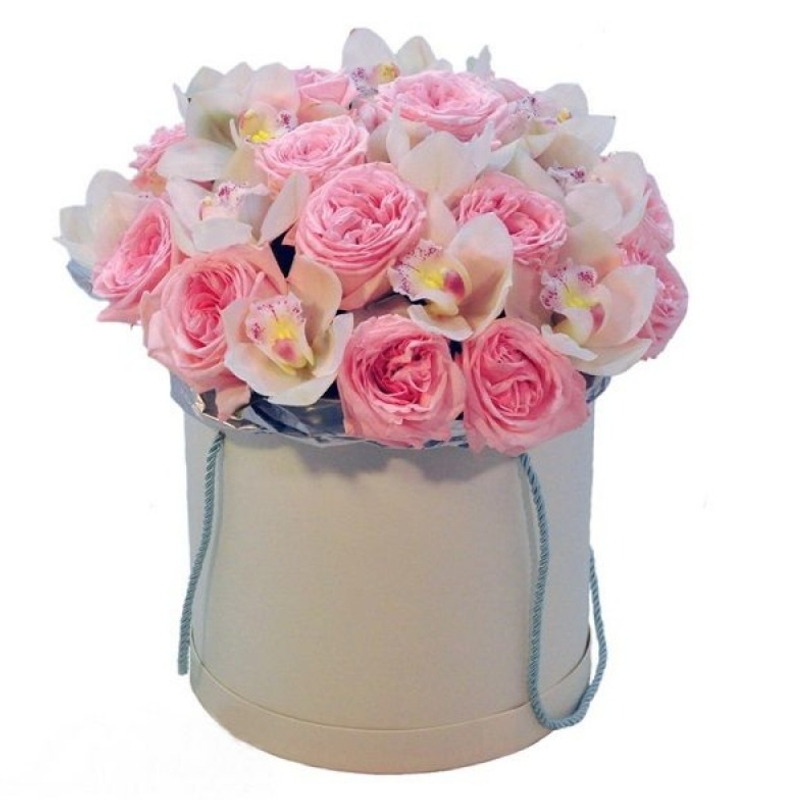 Букет состоит из 21 розовая пионовидная роза, 10 орхидей, коробка, оазис.