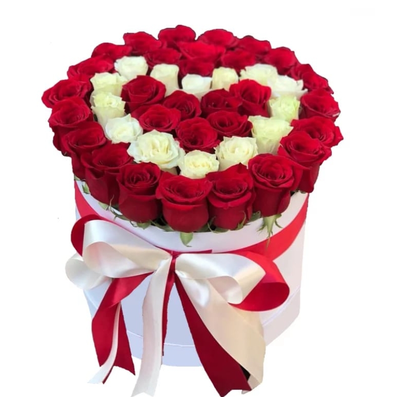 Сердце из 45 красных и белых роз в коробке