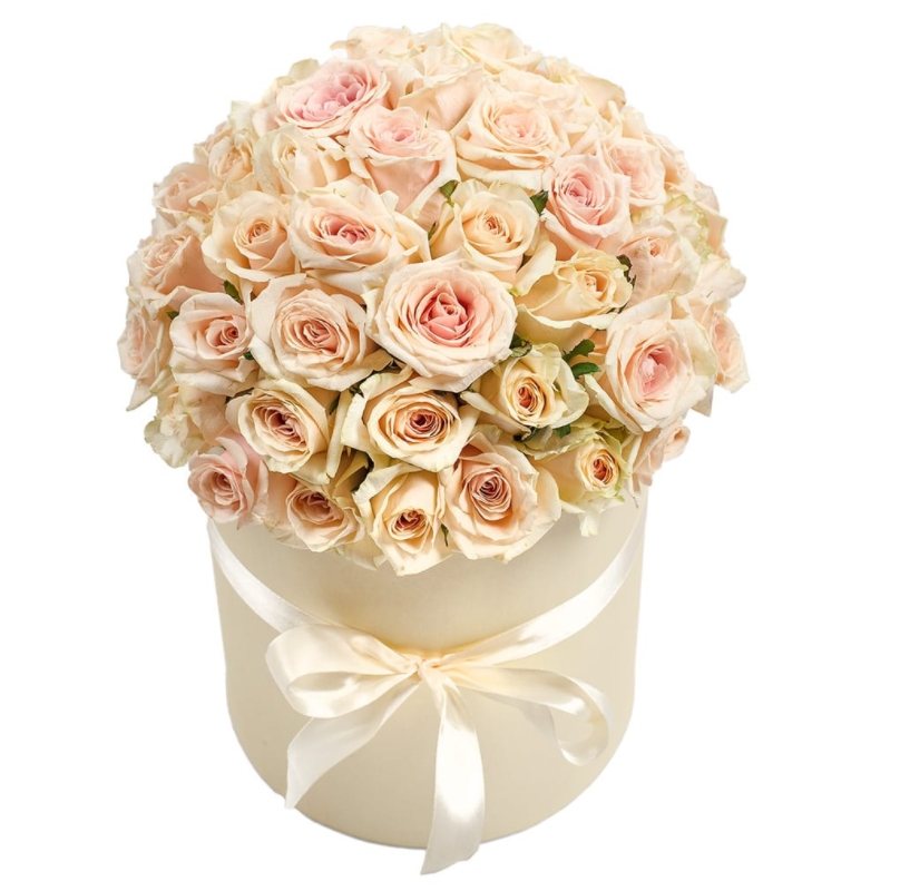 Букет состоит из 51 кремовая роза, коробка, атласная лента.