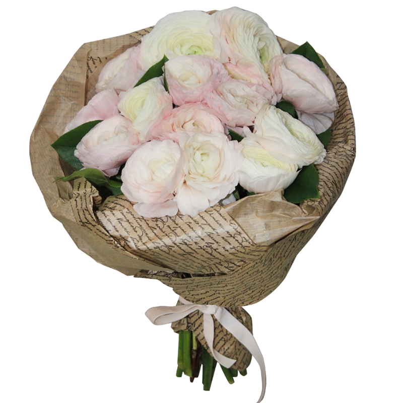 Букет состоит из 15 ранункулюсов, зелень, крафт, атласная лента.